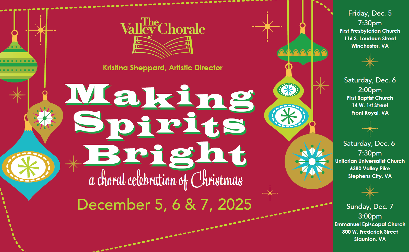 The Valley Chorale performs a repertoire that balances innovation and tradition, seeking out new and contemporary composers writing for our time while still embracing the steadfast brilliance of historical works. We specialize in material that engages, inspires and uplifts our audiences while challenging and enriching our ensemble of singers as well as contributing to the cultural life of our region.